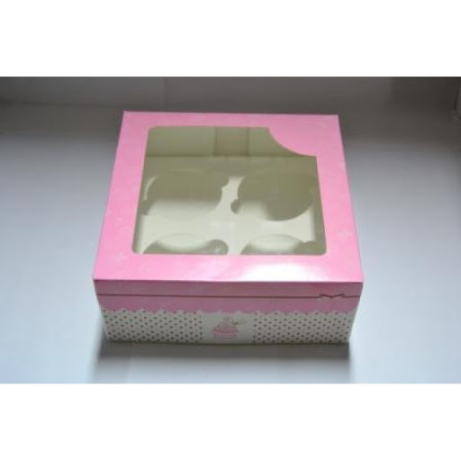 • Caixa para 4 cupcakes com tampa rosa e branco e janela transparente