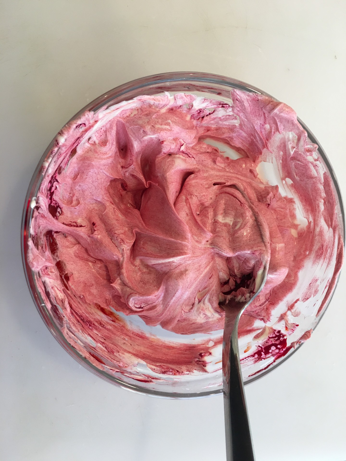 Tigela de vidro com creme rosa e colher metálica