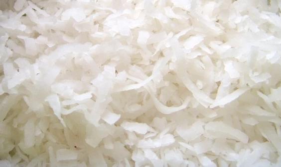 Close-up de coco ralado branco com textura fibrosa