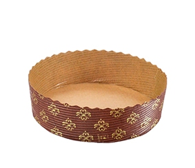 • Forma redonda de papel castanho com padrão dourado e bordas onduladas