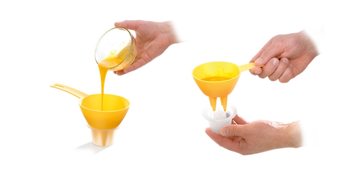 • Funil plástico amarelo com pegador, usado para verter líquido amarelo, em fundo branco.