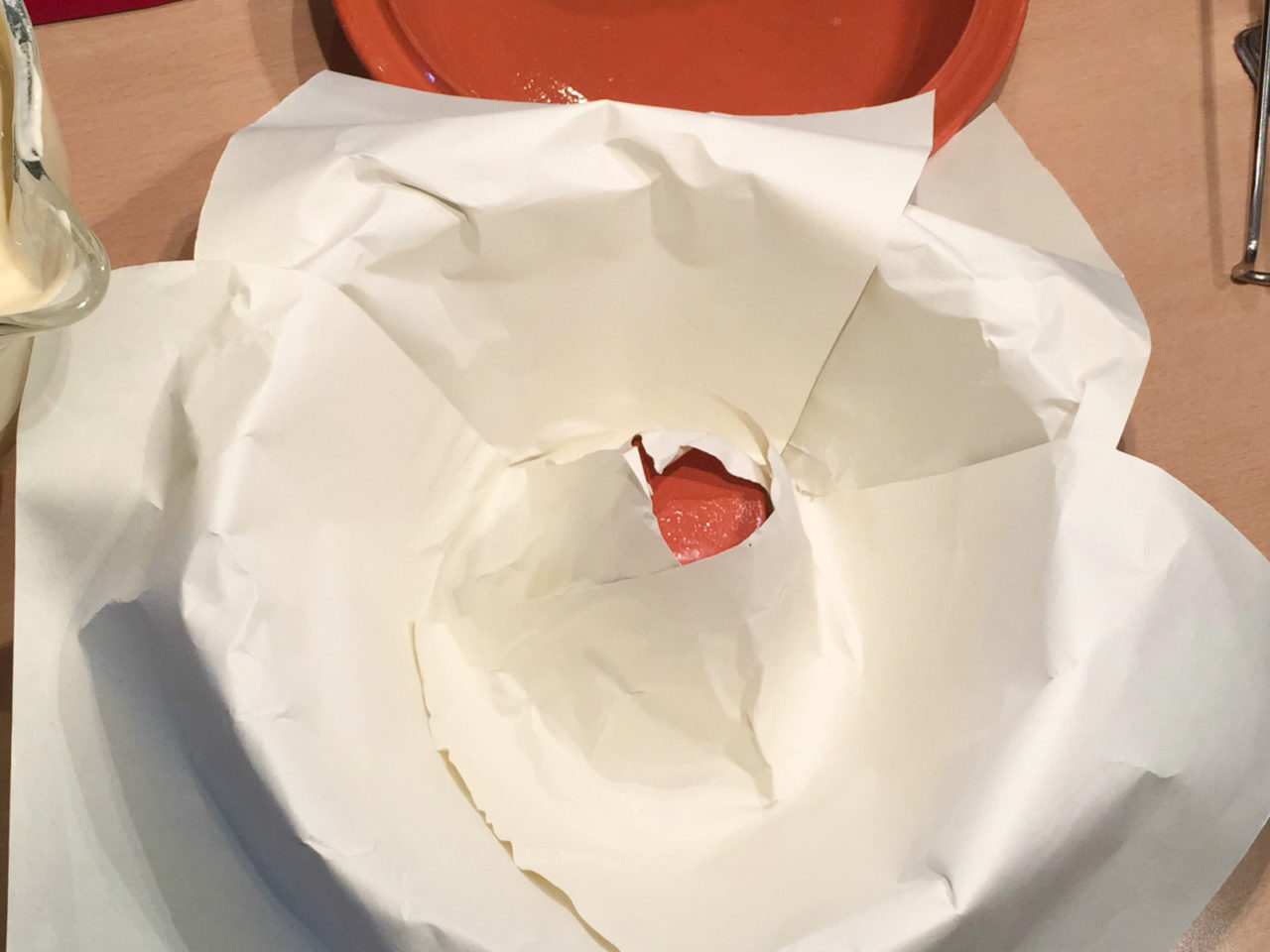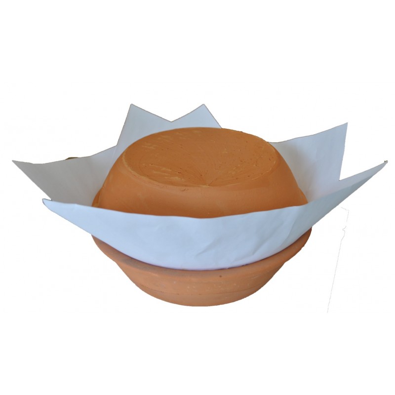 • Tigela de barro com tampa e papel branco entre os dois, fundo branco