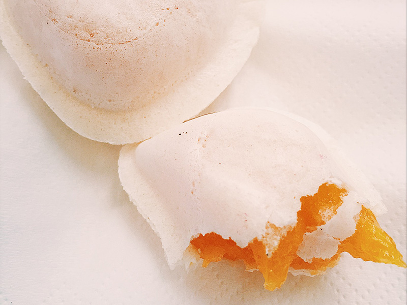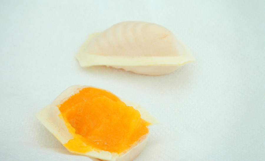 • Dois raviolis brancos, um aberto mostrando recheio laranja