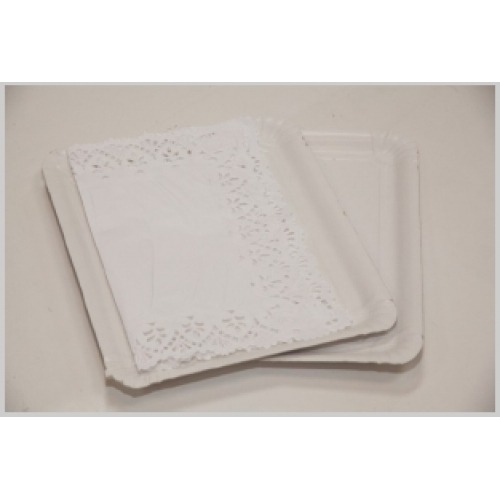 • Duas bandejas retangulares brancas, uma com papel rendado branco